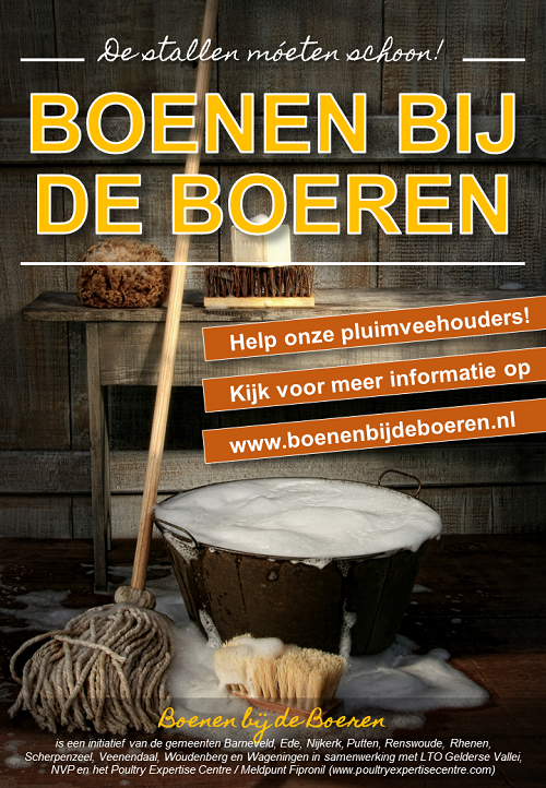 De gemeenten in de Gelderse Vallei zijn een schoonmaak- en opruimactie gestart om de door fipronil besmette stallen van pluimveehouders te reinigen. De campagne “Boenen bij de Boeren” werd gisteren gelanceerd tijdens een pluimveebijeenkomst in Barneveld. Het schoonmaken en het regelmatig verwijderen van mest en strooisel blijkt volgens deskundigen de meest effectieve manier om fipronil te bestrijden. Om pluimveehouders hierbij te helpen, worden vrijwilligers gezocht.